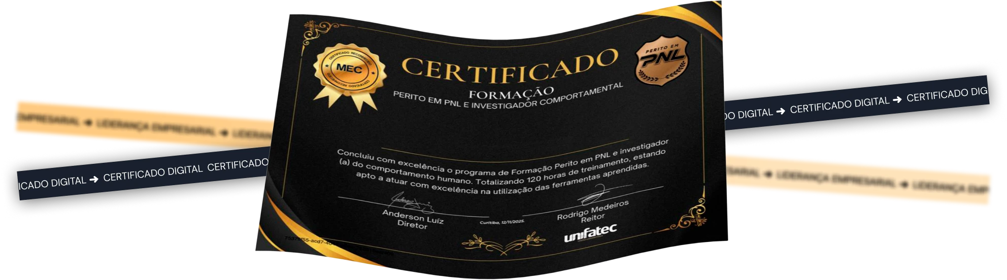 É a única formação de PERITO EM PNL no Brasil. Somente aqui você recebe um certificado validado academicamente pelo MEC, que te coloca em outro patamar profissional.